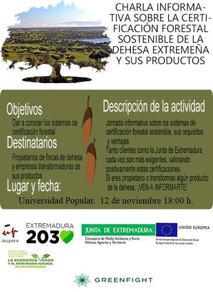 La Universidad Popular de Arroyo de la Luz acogerá el próximo lunes 12 de octubre, a partir de las 18.00 horas, una jornada informativa ... sobre la certificación forestal sostenible de la dehesa extremeña y sus productos, certificación con la que tanto clientes como la Junta de Extremadura cada vez son más exigentes.