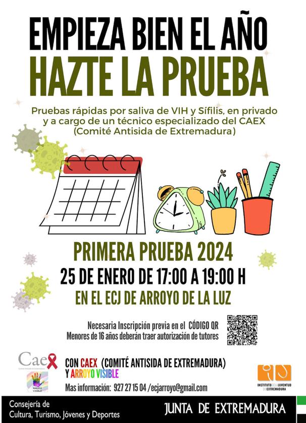 El CAEX (Comité Antisida de Extremadura), junto a la Asociación Arroyo Visible y el Instituto de la Juventud de Extremadura de la Consejería de Cultura, ... Turismo, Jóvenes y Deportes de la Junta de Extremadura, van a volver a poner en marcha para el 2024 una nueva campaña de pruebas de VIH y Sífilis.