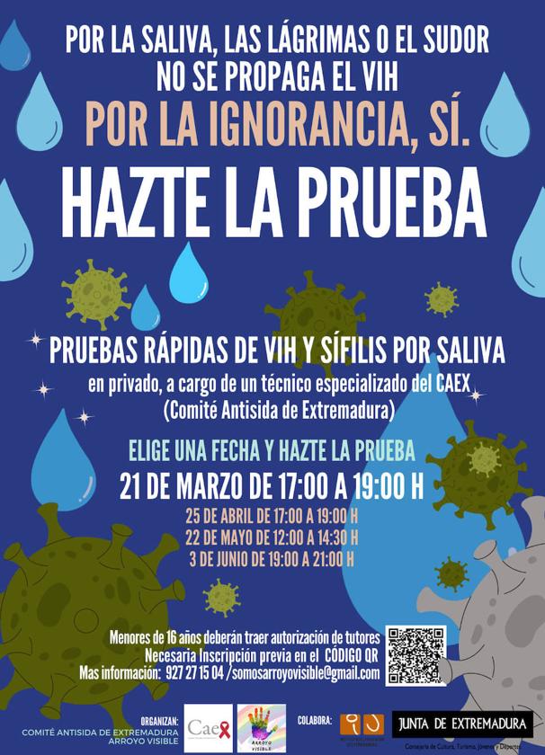 El CAEX (Comité Antisida de Extremadura), junto a la Asociación Arroyo Visible y el Instituto de la Juventud de Extremadura de la Consejería de Cultura, ... Turismo, Jóvenes y Deportes de la Junta de Extremadura, han vuelto a poner en marcha para el 2024 una nueva campaña de pruebas de VIH y Sífilis.