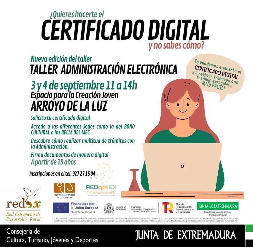 Tras la primera sesión celebrada a principios del pasado mes de julio, días 3 y 4 del próximo mes de septiembre RedEx volverá al Espacio para la Creación Joven de Arroyo de la Luz para una nueva edición del Taller de Administración Electrónica.