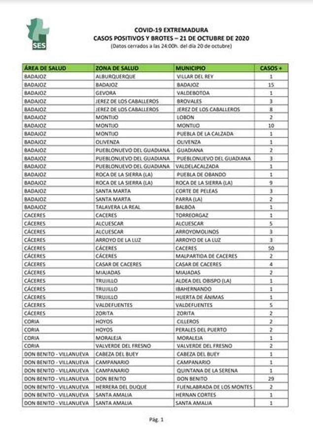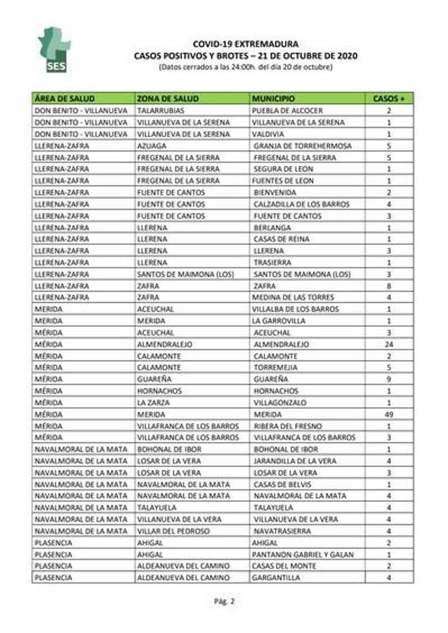 Cáceres, con 50 casos, es la localidad con más positivos de covid notifica este miércoles. Le siguen Mérida, con 49; Don Bentio, con 29; Almendralejo ( ... 24); Plasencia, con 19; Badajoz, con 15; Montijo, con 10; La Roca de la Sierra, con nueve; y, con ocho, Zafra, Jerez de los Caballeros y Cabezuela del Valle.
