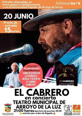 El Ayuntamiento de Arroyo de la Luz ha informado, a través de la aplicación web Bandomóvil, que el próximo 20 de junio, a las 21. ... 30 horas, tendrá lugar una charla-masterclass con Allan Savory, 'Cómo reverdecer la Península Ibérica y revertir el cambio climático', además de una actuación de 'El Cabrero', en el Cine-Teatro Municipal de Arroyo de la Luz.