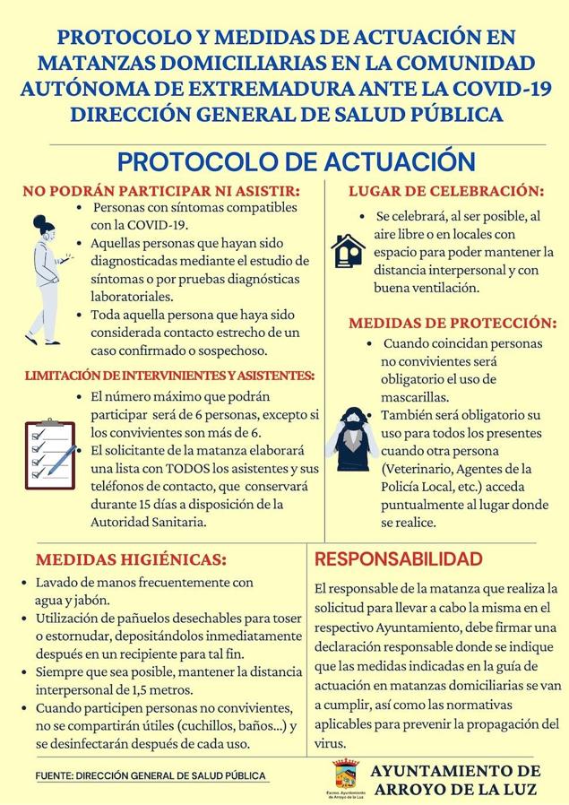 En estas fechas es tradición la realización de las matanzas en la región extremeña. Para evitar los posibles contagios que pudieran darse este año, encontrándonos ... en la actual situación de crisis sanitaria, el Ayuntamiento arroyano ha facilitado a la población, a través de la aplicación web Bandomóvil, el protocolo y guía de actuación para las mencionadas matanzas domiciliarias de la Dirección General de Salud Pública.
