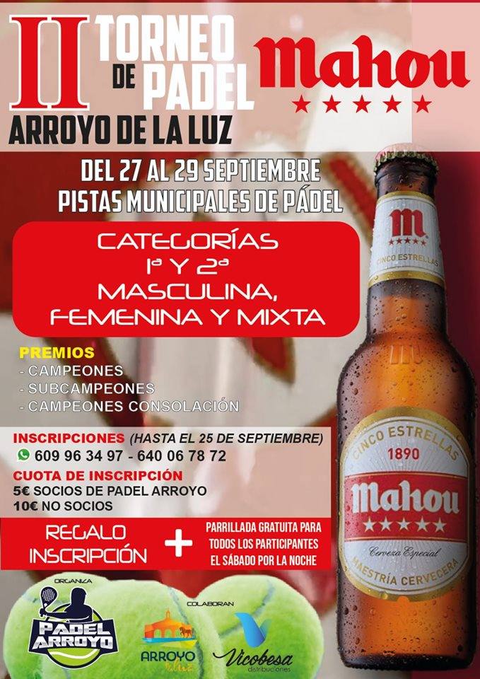 El próximo fin de semana, del 27 al 29 de septiembre, Arroyo de la Luz acogerá el II Torneo de Pádel Mahou, en las pistas ... municipales de Pádel. El torneo está organizado por Pádel Arroyo, con la colaboración del Ayuntamiento de la localidad y Vicobesa.