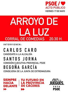 Hoy viernes, a las 20.30 horas, tendrá lugar en el Corral de Comedias de Arroyo de la Luz el mitin del Partido Socialista Obrero ... Español.
