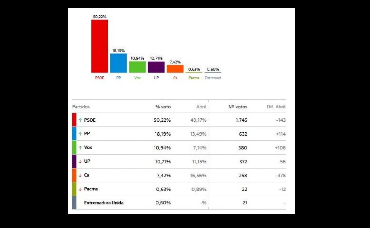Por su parte, descienden en número de votos Unidas Podemos y Ciudadanos, con 372 (10,71%) y 258 (7,42%) votos respectivamente, así como Pacma, que ha conseguido 22 votos. Aparece además Extremadura Unida, con 21 votos. Ciudadanos ha protagonizado un gran descenso también a nivel local, del 16,56% de abril al 7,42%. En el caso de UP el descenso ha sido del 11,15% al 10,71%.