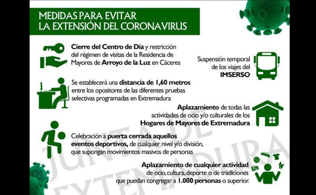 La Junta de Extremadura ha distribuido por la población un sencillo cartel en el que se recogen algunas de las cosas que se deben hacer ... o evitar por parte de los ciudadanos para que el corona virus no se expanda. Se ha editado tras el primer caso de muerte ocurrido en Arroyo de la Luz.