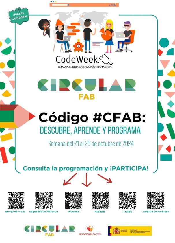Entre el 21 y el 25 del presente mes de octubre se celebrará la Code Week 2024 con una gran programación, a la que se ... ha sumado la Red de Centros de Innovación Territorial Circular FAB de la provincia de Cáceres con el lema 'Código CFAB: Descubre, aprende y programa0.