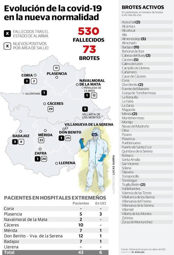 Este jueves se han declarado otros tres brotes en Extremadura. Los nuevos focos se localizan en Cáceres (con 6 positivos confirmados y 5 contactos); la población pacense de La Haba (5 positivos y 21 contactos) y Almendralejo (12 positivos y 30 contactos).