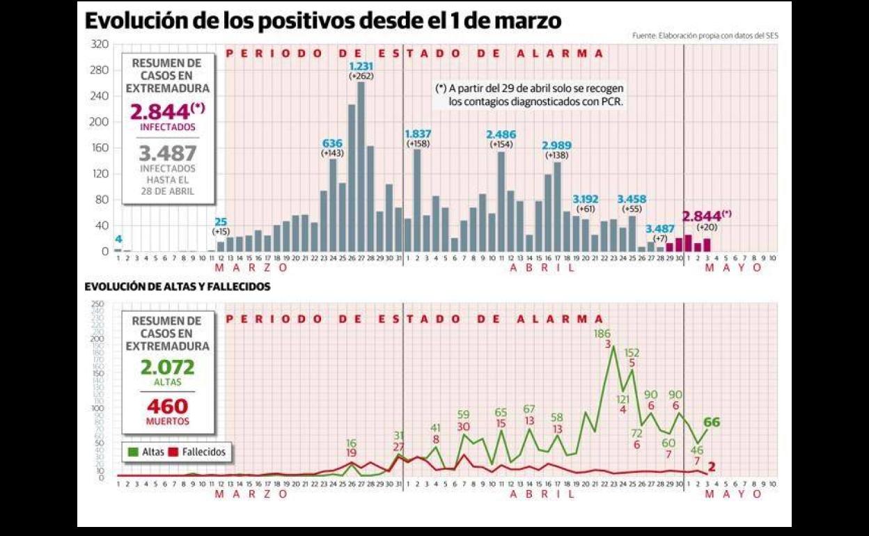 Según el informe de la Dirección General de Salud Pública, Extremadura ha sumado también 20 positivos más de coronavirus detectados por PCR, por lo que la cantidad de contagios en Extremadura asciende a 2.844 desde el comienzo de la crisis sanitaria. Precisamente, la tasa de infección y el incremento porcentual de nuevos positivos, uno de los parámetros clave para la desescalada, continúa situándose en la comunidad extremeña por debajo del 1%. Esa tasa, que refleja el riesgo de que un contagiado infecte a una persona, en estos momentos está en el 0,71% en la región.