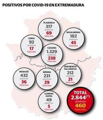 El área de salud de Coria acumula un total de 92 positivos confirmados por prueba PCR, acumula 17 fallecidos y 87 pacientes curados. Hay 39 personas en aislamiento domiciliario. La zona no tiene pacientes COVID-19 ingresados en el hospital.