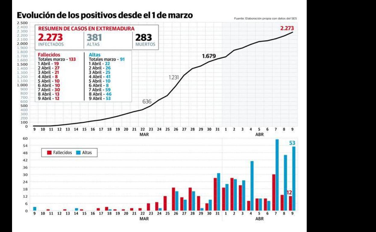 Estos datos invitan a pensar que lo peor de la pandemia ya ha pasado en Extremadura, como sostiene el Ejecutivo autonómico. Pese a ello, no hay que bajar la guardia, ya que sigue aumentando el número de contagiados por coronavirus pese a las medidas de aislamiento social.