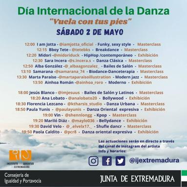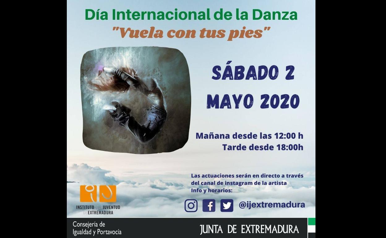 El Espacio para la Creación Joven de Arroyo de la Luz invita a disfrutar del cartel que ha prerado el IJEX para hoy sábado 2 ... de mayo, día en que se celebra el Día Internacional de la Danza. Así, para conmemorar este día desde casa, han organizado la actividad 'Vuela con tus pies', donde se llevarán a cabo masterclasses y exhibiciones de danza a través de Instagram.