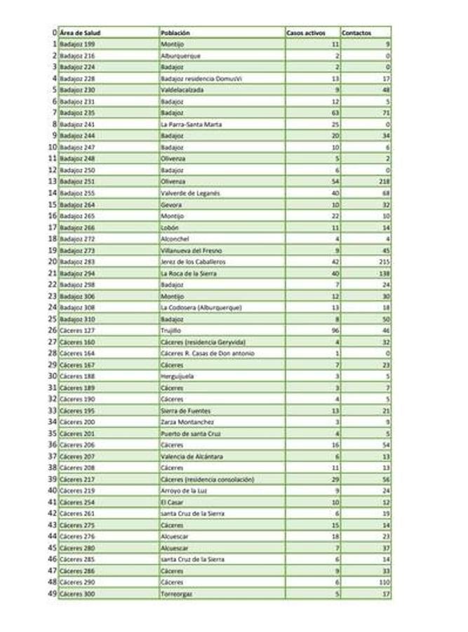 Según el informe de Salud Pública, en el área de Badajoz hay 25 brotes; en la de Cáceres, 27; en la de Mérida, 22; en la de Plasencia, 3; en la de Don Benito-Villanueva, 14; en la de Navalmoral de la Mata, 8; en la de Llerena-Zafra, 15; y en la de Coria, 8.