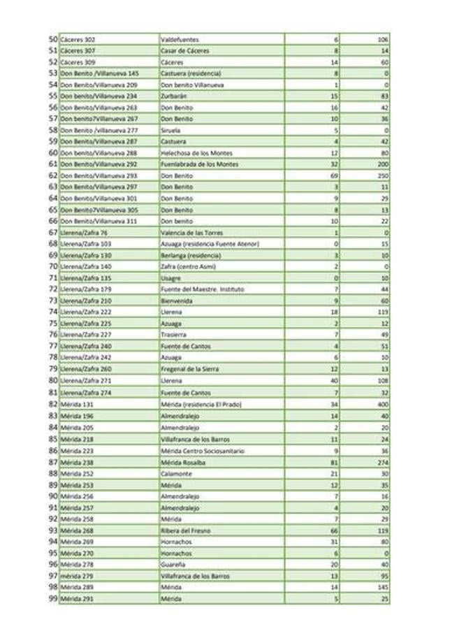 Por último, en Olivenza también hay un foco, el 251, que supera el medio centenar de casos con 54. Además, tiene a 218 personas en estudio.