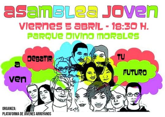 La asamblea joven de la Plataforma de Jóvenes Arroyanos que estaba programada para hoy viernes, 5 abril, en el parque del Divino Morales, ha sido ... suspendida por la lluvia. En los próximos días informarán de la nueva fecha y lugar elegidas.