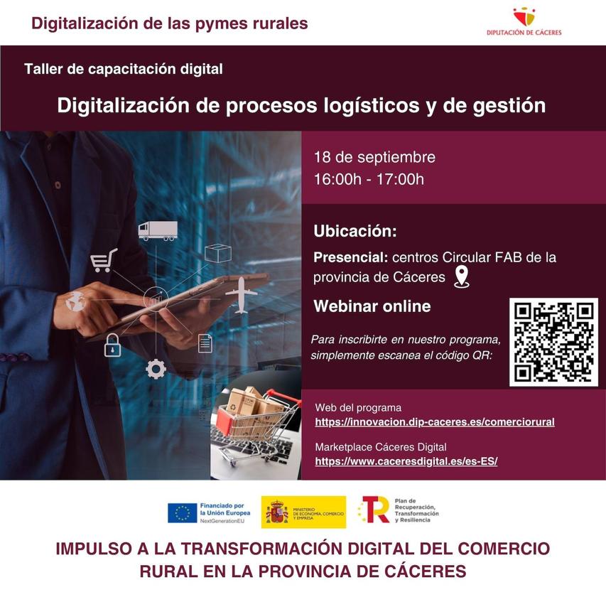 Mañana miércoles, día 18 de septiembre, en horario de 16.00 a 17.00 horas, el Circular Fab de Arroyo de la Luz acogerá un nuevo taller de capacitación digital. En este caso se trata de un taller de Digitalización de Procesos Logísticos y de Gestión a través del cual se podrá mejorar la eficiencia de los procesos con herramientas digitales.