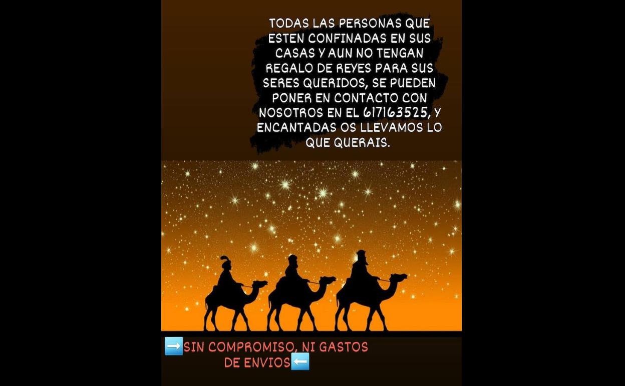 Debido a esta difícil situación y ante la llegada del día de Reyes, fecha en la que nadie quiere quedarse sin adquirir sus regalos para sus seres queridos, Adela Guzmán, dueña de la tienda de ropa y complementos Galán-t, ubicada en el número 40 de la Plaza Divino Morales, junto a su hija, han puesto en marcha una bonita iniciativa. Han lanzado una publicación a través de sus redes sociales ofreciéndose a llevar sus regalos de Reyes a casa a todas aquellas personas que se encuentren confinadas, convirtiéndose así en pajes reales para ayudar a Sus Majestades los Reyes Magos de Oriente.