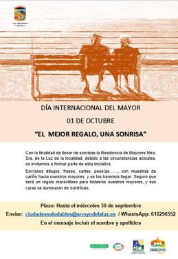 Mañana jueves, día 1 de octubre, se celebra el Día Internacional del Mayor. Para conmemorar esta fecha, desde la Oficia de Ciudades Saludables y Sostenibles ... del Ayuntamiento de Arroyo de la Luz, han organizado la actividad 'El mejor regalo, una sonrisa'.