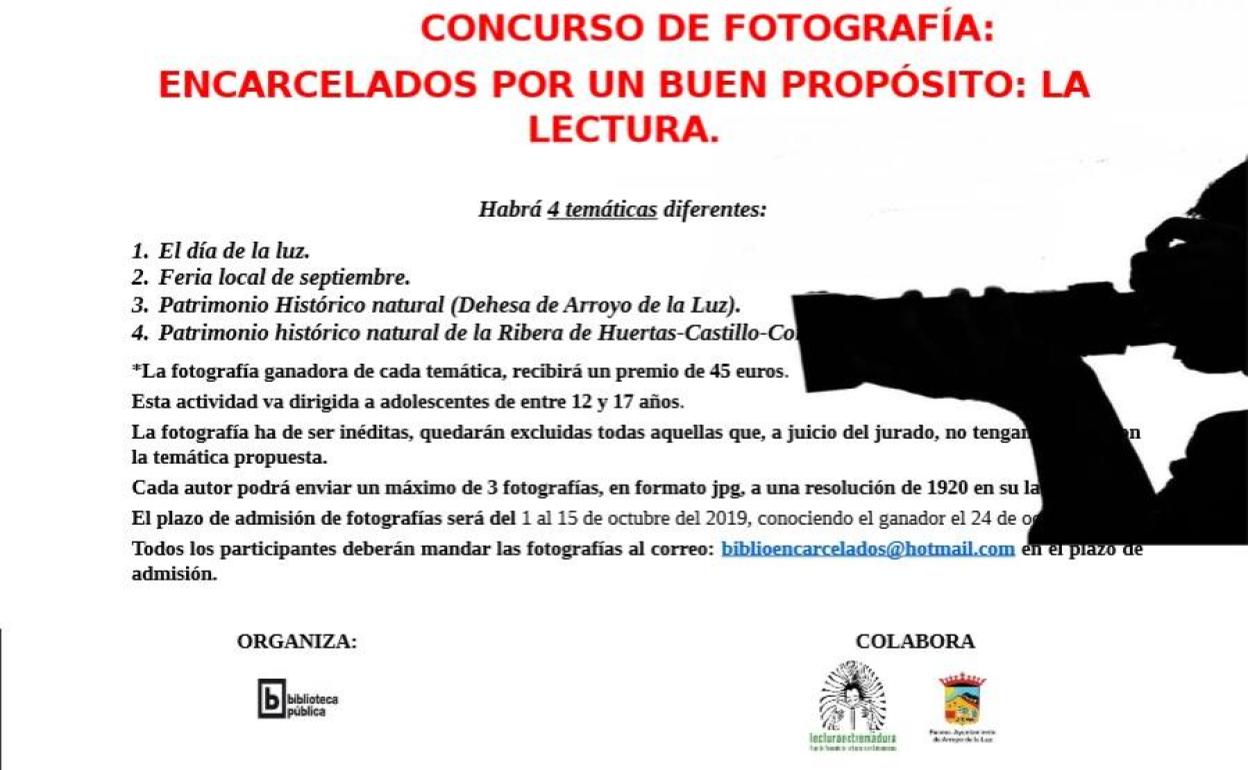 La Biblioteca Pública Municipal de Arroyo de la Luz, en colaboración con el Ayuntamiento de la localidad, ha organizado el concurso fotográfico 'Encarcelados por una ... buena causa, la lectura', que se encuadra dentro del conjunto de actividades realizadas del plan de fomento de lectura. El plazo de presentación de las fotografías finaliza hoy lunes, día 21 de octubre, y deberán remitirse a la dirección biblioencarcelados@hotmail.com