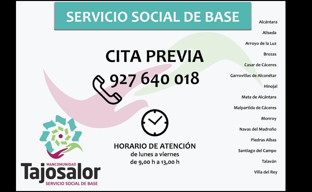 La Mancomunidad Tajo Salor recuerda a través de sus redes sociales que las personas que lo necesiten pueden pedir cita previa a los Servicios Sociales ... de Base en el teléfono 927 640 018 en los pueblos de Alcántara, Aliseda, Arroyo de la Luz, Brozas, Casar de Cáceres, Garrovillas de Alconétar, Hinojal, Mata de Alcántara, Malpartida de Cáceres, Monroy, Navas del Madroño, Piedras Albas, Santiago del Campo, Talaván y Villa del Rey.