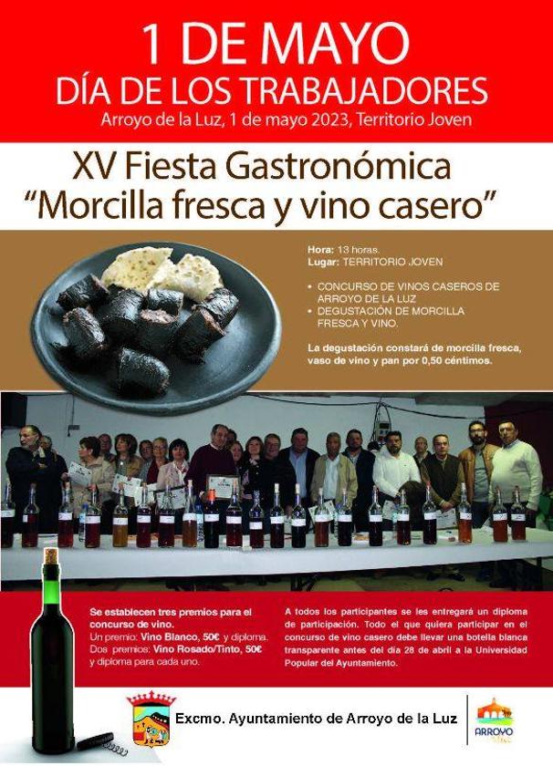 Arroyo de la Luz volverá a disfrutar este año de otra de sus fiestas gastronómicas dedicada a otro de sus productos más representativos, la Fiesta ... Gastronómica 'Morcilla Fresca y Vino Casero', organizada por el Ayuntamiento de la localidad, que este año cumple su edición XV, celebrándose el 1 de mayo.