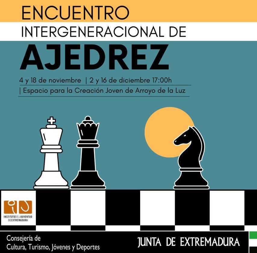 Para hoy sábado, día 18 de noviembre, el Espacio para la Creación Joven de Arroyo de la Luz tiene organizado un nuevo Encuentro Intergeneracional de ... Ajedrez.